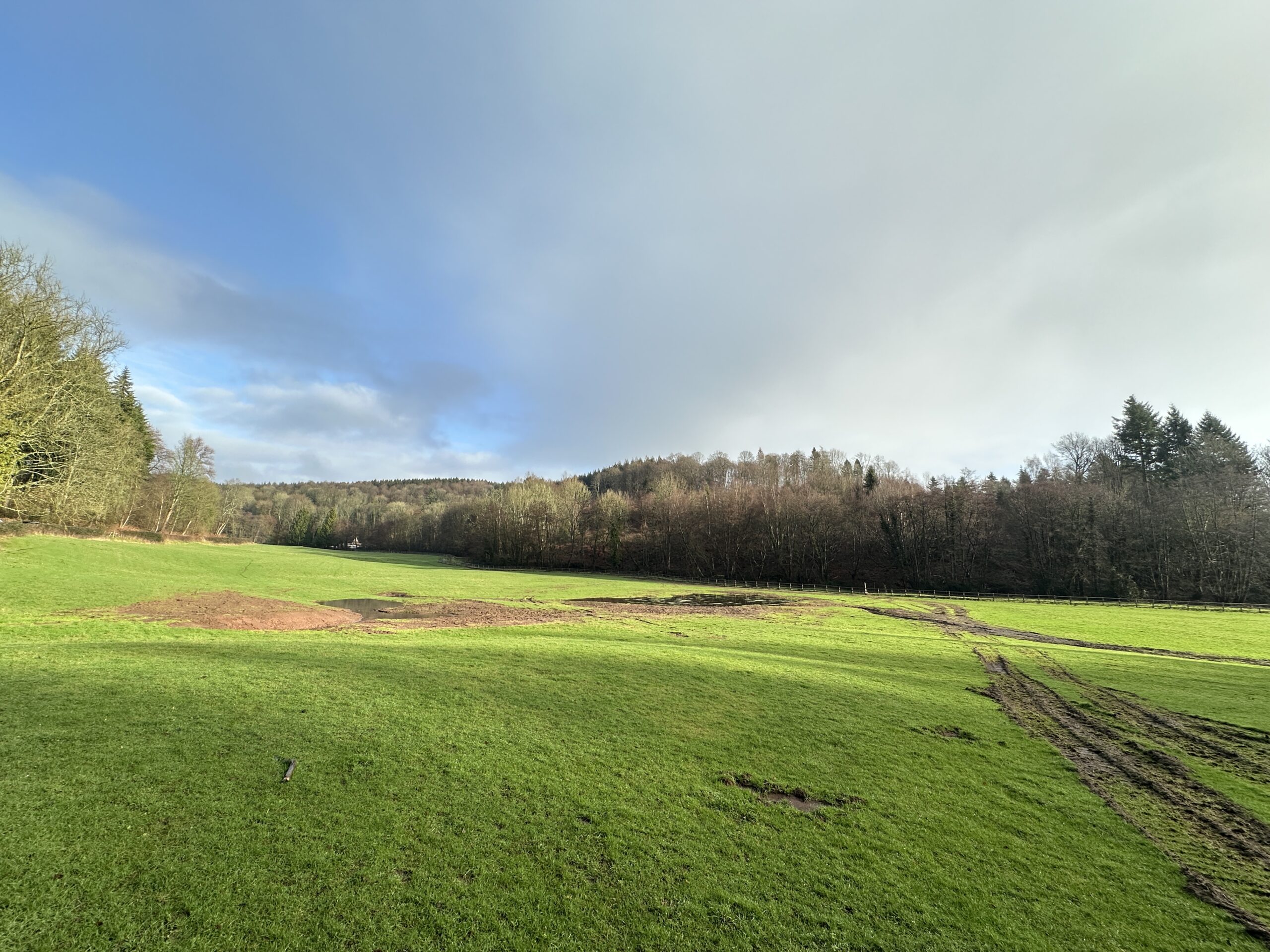 Upstream of Flaxley, our team introduced Large Woody Material (LWM) into the brook and created shallow scrapes and wetland features across the floodplain.